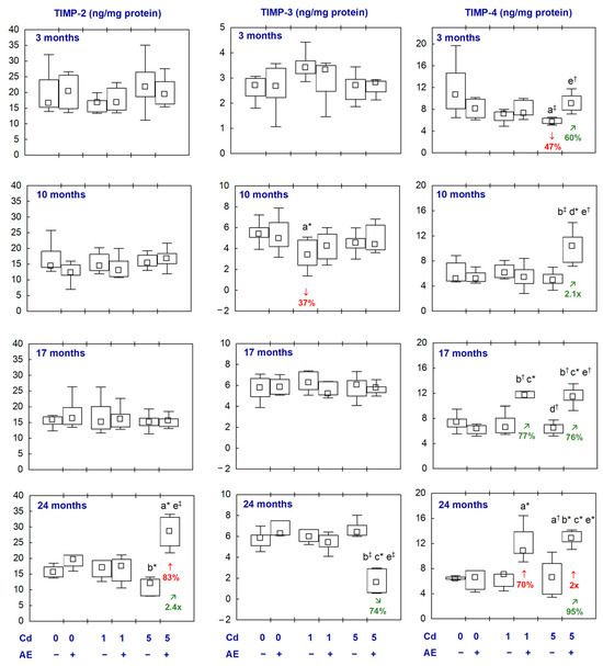 The treatment with Cd had no impact on the concentrations of the examined TIMPs in the brain, except for a temporary decrease (by 37%) in the concentration of TIMP-3 in the Cd1 group (after 10 months) and in the concentration of TIMP-4 in the Cd5 group (after 3 months) (Figure 7, Table S7). In the animals supplemented with AE under the exposure to Cd, the concentrations of TIMPs did not differ compared to the control group, except for increased concentrations of TIMP-2 in the Cd5 + AE group (by 83%) and TIMP-4 in the Cd1 + AE and Cd5 + AE groups (70% and 2-fold, respectively) after 24 months (Figure 7, Table S7).