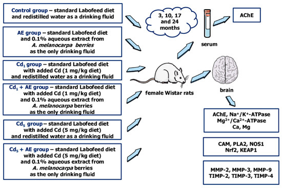 The schematic representation of the experimental model and measured parameters. AChE, acetylcholinesterase; AE, Aronia melanocarpa L. berries extract; Ca, calcium; Ca2+/Mg2+-ATPase, calcium-magnesium adenosine triphosphatase; CAM, calmodulin; KEAP1, Kelch-like ECH-associated protein 1; Mg, magnesium; MMP, metalloproteinase; Na+/K+-ATPase, sodium-potassium adenosine triphosphatase; NOS1, nitric oxide synthase 1; Nrf2, nuclear factor erythroid 2-related factor 2; PLA2, phospholipase A2; TIMP, tissue inhibitor of metalloproteinase. This figure was prepared using the templates available on the Servier Medical Art website (Creative Commons Attribution 4.0 unported license).