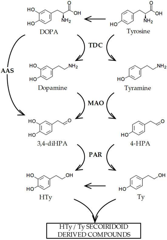 Biosynthesis pathway proposed for the phenolic alcohols hydroxytyrosol (HTy) and tyrosol (Ty) in olive [10]. The abbreviated intermediate metabolites and enzymes are as follows: 3,4 dihidroxyphenylacetaldehyde (3,4-diHPA); 4-hydroxyphenylacetaldehyde (4-HPA); tyrosine decarboxylase (TDC); monoamino oxidase (MAO); aromatic aldehyde synthase (AAS); phenylacetaldehyde reductase (PAR).