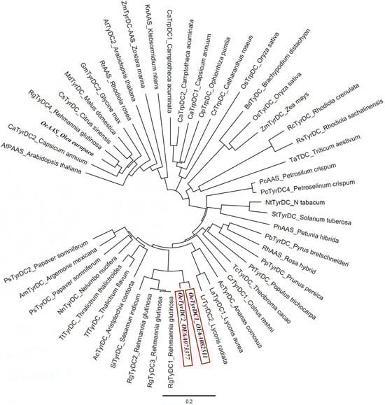 Phylogenetic tree illustrating the relation of olive TDCs (framed in red) to other plant AAADs. Accession numbers of the different AAS/TyDC included in the analysis are shown in Table S2.