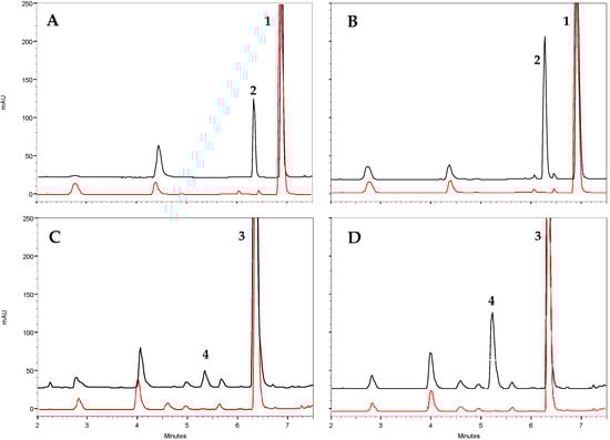 Functional characterization of the purified recombinant olive TDC proteins by in vitro enzyme assays. Representative HPLC analysis (black trace) of the reaction of OeTDC1 and OeTDC2 toward tyrosine (A and B, respectively) and toward DOPA (C and D, respectively). The peaks in the chromatograms represent 1, tyrosine (Rt = 6.9 min); 2, tyramine (Rt = 6.3 min); 3, DOPA (Rt = 6.4 min); and 4, dopamine (Rt = 5.2 min). Control reactions (red trace) used protein deactivated at 100 °C for 1 h.