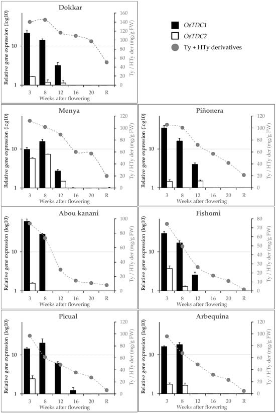 Putative TDC genes involved in the biosynthesis of Ty and HTy phenolic derivatives in olive fruit were selected from those annotated as tyrosine and tyrosine/DOPA decarboxylase in a transcriptomic study involving olive cultivars with distinct phenolic contents (Table S1) [10]. These genes were annotated using Sma3s [34] and Blast2GO v5.2 [35] software against the olive genome database (OE6.OLIVEFAT, https://denovo.cnag.cat/olive_data, accessed on 19 December 2017).