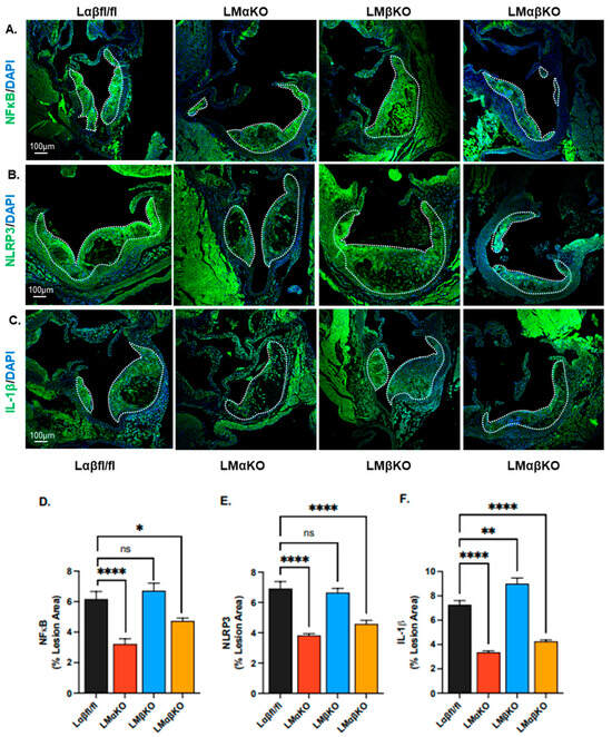 As previously observed, myeloid GSK3α deficiency attenuates the development of atherosclerosis at the aortic sinus in Ldr−/− mice (Figure 1) [8]. Deficiency of GSK3β has no significant effect on atherosclerotic volume. To explore the effects of GSK3α/β deficiency on lesional inflammatory response, the expression of markers related to inflammation was examined in cross sections of the aortic sinus. Expressions of these markers were quantified in each of the experimental groups using immunofluorescent staining with antibodies against nuclear factor kappa-light-chain-enhancer of activated B cells (NFκB), Nod-like receptor family pyrin domain containing 3 (NLRP3), or IL-1ꞵ (Figure 2A–C).