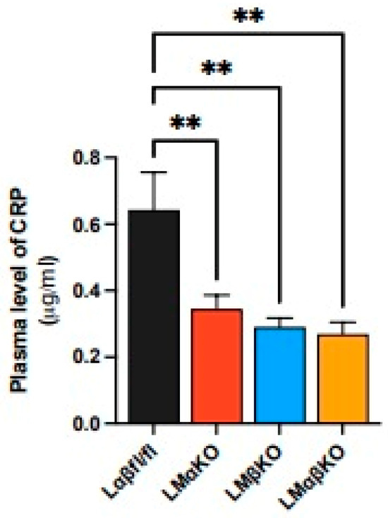 To determine the effects of GSK3α/β deficiency on systemic inflammatory responses, the plasma level of C-reactive protein (CRP) was quantified. LMαKO, LMβKO, and LMαβKO mice showed decreased plasma CRP levels compared to Lαβfl/fl controls (Figure 3). This finding suggests that both myeloid GSK3α and GSK3β may play a role in systemic inflammation.