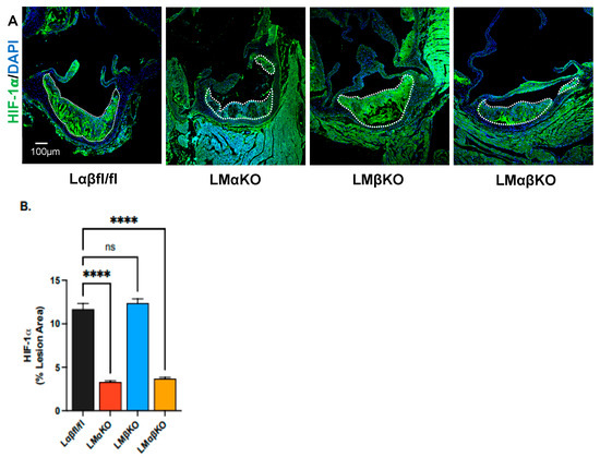 Cross sections of the aortic sinus were immunostained with an antibody against hypoxia-inducible factor (HIF)-1α (Figure 4A). LMαKO and LMαβKO mice had decreased levels of HIF-1α compared to Lαβfl/fl controls (Figure 4B). LMβKO mice showed no changes in HIF-1α compared to the Lαβfl/fl controls (Figure 4B). This suggests that myeloid GSK3α plays a role in activation of lesional HIF-1α which may affect atherogenesis.