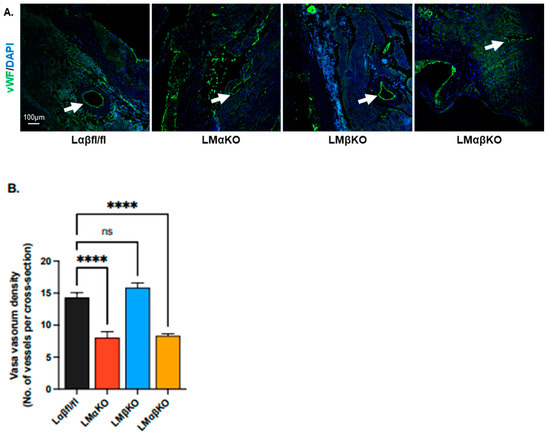 To measure the vasa vasorum density at the aortic sinus and ascending aorta, aortic cross sections were immunostained with an antibody against endothelial marker, Von Willebrand factor (vWF), and the number of positively stained microvessels per cross section were quantified (Figure 5A). LMαKO and LMαβKO mice had relatively fewer positively stained microvessels compared to Lαβfl/fl controls (Figure 5B). LMβKO mice showed no change in microvessel numbers compared to the Lαβfl/fl controls. These findings suggest that myeloid GSK3α deficiency significantly reduced microvessel density (Figure 5B).