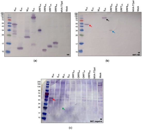 Identification of SARS-CoV-2 proteins expressed by the MVA-T7pol system. To detect the targeted SARS-CoV-2 proteins, CEF cells were infected with recombinant MVA-T7pol at an MOI of 10 and transfected with the vector plasmids pOS6 [] or pTM3 [] containing the encoding sequences of the targeted SARS-CoV-2 proteins that were placed under the T7 promoter. To express SARS-CoV-2 spike protein, CEF cells were infected with recombinant MVA-SHA at an MOI of 10. Proteins were separated by SDS-PAGE and analyzed with an antibody directed against the HA-tag (a) or by using human serum (b,c). Non-infected cells (Mock) and cells infected with MVA-T7pol served as controls. Lane 1: NHA (47 kDa); lane 2: EHA (10 kDa); lane 3: MHA (26 kDa); lane 4: SHA (190 kDa + 90 kDa) []; lane 5: ORF3aHA (32 kDa); lane 6: ORF6HA (8 kDa); lane 7: ORF7aHA (14 kDa); lane 8: ORF8HA (15 kDa); lane 9: MVA-T7pol; lane 10: non-infected cells (Mock). Red arrow: N protein; black arrow: S protein; blue arrow: ORF3a protein; green arrow: M protein.