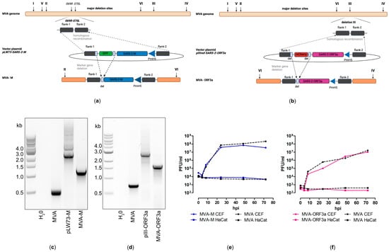 Virological characterization of MVA-SARS-CoV-2-M (MVA-M) and MVA-SARS-CoV-2-ORF3a (MVA-ORF3a). (a,b) Schematic diagram of the MVA genome with the major deletion sites I to VI. (a) The encoding sequence of the full-length SARS-CoV-2 membrane protein (M) was inserted into the vector plasmid pLW73 [] (pLW73-M). Expression of SARS-CoV-2-M was controlled by the VACV-specific promoter PmH5 [] and was inserted via homologous recombination between MVA DNA sequences (flank-1, flank-2) adjacent to the intergenomic region between the open reading frames (ORF) of the essential viral genes, MVA069R and MVA070L, and copies cloned in the MVA vector plasmid pLW73-M. Repetitive sequences served to remove the marker gene GFP by intergenomic homologous recombination (marker gene deletion) to generate MVA-M. (b) The deletion III site was targeted to insert the gene sequence encoding SARS-CoV-2-ORF3a under the transcriptional control of VACV promotor PmH5 []. Repetitive sequences served to remove the marker gene mCherry by intragenomic homologous recombination (marker gene deletion) to generate MVA-ORF3a. (c,d) Genetic integrity of MVA-M and MVA-ORF3a. PCR analysis of genomic viral DNA confirmed stable insertion of the SARS-CoV-2-M sequence into the intergenomic region between 069R and 070L of the MVA genome and SARS-CoV-2-ORF3a sequence inserted into the deletion III of the MVA genome. (e,f) Multiple-step growth analysis of recombinant MVA-M, MVA-ORF3a, and non-recombinant MVA (MVA). Recombinant viruses and non-recombinant MVA (MVA) amplified in CEF cells but failed to efficiently grow in human HaCat cells.
