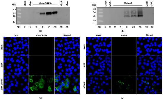 Synthesis of membrane (M) and ORF3a proteins in MVA-M- and ORF3a-infected cells. (a,b) CEF cells were infected at an MOI of 5, and cell lysates were collected at 0, 4, 8, 24, and 48 h post infection (hpi). Polypeptides in the cell lysates were separated by SDS-PAGE and analyzed with antibodies against the M and ORF3a proteins. (c,d) Vero cells were infected at an MOI of 0.5 with MVA-M or MVA-ORF3a and fixed with paraformaldehyde after 16 hpi. Permeabilized cells were probed with antibodies against the M and ORF3a proteins. Polyclonal goat anti-mouse secondary antibody was used for M-specific fluorescent staining (green), and polyclonal goat anti-rabbit secondary antibody was used for ORF3a-specific fluorescent staining (green). Cell nuclei were counterstained with DAPI (blue). Scale bar: 50 μm.
