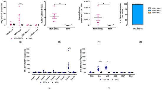 Activation of SARS-CoV-2-M- and SARS-CoV-2-ORF3a-specific CD8 T cells after vaccination with MVA-M and MVA-ORF3a. Groups of HLA-A2.1-/HLA-DR1-transgenic H-2 class I-/class II-knockout mice (n = 6–10) were immunized with 107 PFU of MVA-M or MVA-ORF3a via the i.m. route. Mice immunized with non-recombinant MVA (MVA) served as controls. Splenocytes were collected and prepared at day 35 after prime immunization (14 days after booster immunization). Splenocytes were either stimulated with SARS-CoV-2-ORF3a- or SARS-CoV-2-M-specific peptides and were measured by IFN-γ ELISPOT assay (a,e,f) and intracellular cytokines staining (ICS) plus FACS analysis (b–d). (a,e,f) IFN-γ spot-forming colonies (SFC) measured by ELISPOT assay. (b,c) IFN-γ producing CD8 T cells measured by FACS analysis. Graphs show the mean frequency and absolute number of IFN-γ+ CD8 T cells. (d) Cytokine profile of ORF3a82-90 specific CD8 T cells. Graph shows the mean frequency of IFN-γ−TNF-α+, IFN-γ+TNF-α+, and IFN-γ+TNF-α− cells within the cytokine-positive CD8 T-cell compartment. Bars represent the mean + standard error of the mean (SEM). Differences between group were analyzed by unpaired, two-tailed t-test: * p < 0.05; ** p < 0.01; ns, not significant.