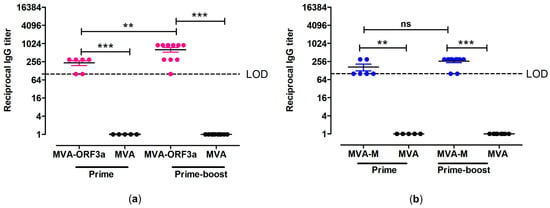 Antigen-specific humoral immunity induced by MVA-ORF3a and MVA-M. (a,b) Groups of HLA-A2.1-/HLA-DR1-transgenic H-2 class I-/class II-knockout mice were immunized with 107 PFU of MVA-M and MVA-ORF3a via the i.m. route. Mice immunized with non-recombinant MVA (MVA) served as controls. Serum samples were collected 18 days after the prime immunization (prime) and 14 days after the booster immunization (prime-boost). Sera were analyzed for (a) ORF3a- and (b) M-specific IgG by ELISA. Dashed lines represent the limits of detection (LOD). Differences between group were analyzed by unpaired, two-tailed t-test: ** p < 0.01; *** p < 0.001; ns, not significant.