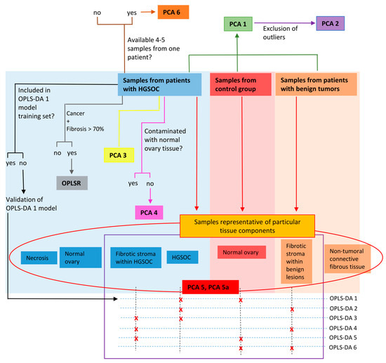 The number of the samples that were representative of particular tissue components and the number of the samples included in PCA model 5a are given in Table 4. In total, 55 samples from 50 patients were included in the PCA 5a model.