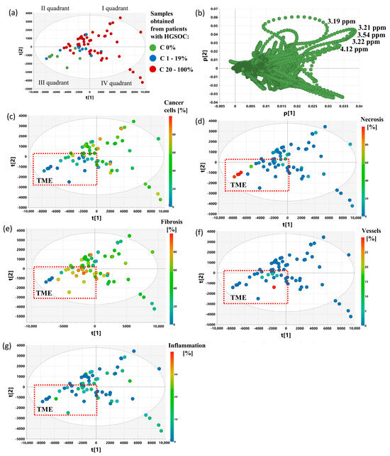 The scores plot obtained from PCA model 4 presenting the distribution of the samples belonging to the following groups: C 0% (the samples containing no cancer cells), C 1–19% (the samples characterized by a cancer content of 20–100%), C 20–100% (the samples characterized by a cancer content of 20–100%) (a) and colored according to the fraction of cancer cells (c) necrosis (d), fibrosis (e), vessels (f), and inflammation (g). The loadings plot obtained from PCA model 4 (b). The presented projection plane represents 62.7% of the total variation in the dataset. The scores for the i-th principal component are denoted as t[i]. TME—tumor microenvironment.