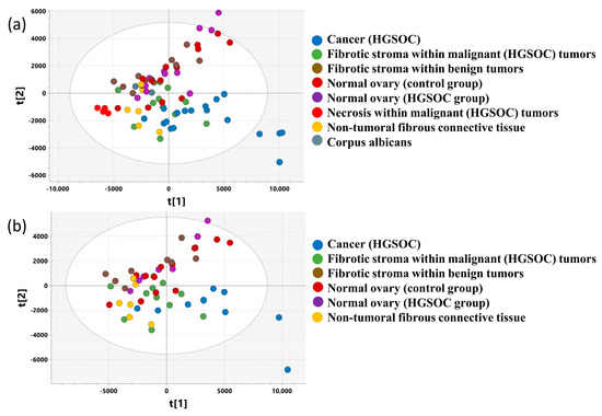 To facilitate comparison of the metabolic properties of different tissue types, the analyzed samples were considered representative of cancer (HGSOC), fibrotic compartment within malignant tumors, fibrotic compartment within benign tumors, normal ovary tissue (the samples collected from the control group), normal ovary tissue (the samples collected from the cancer patients), necrosis, and non-tumoral fibrous tissue (obtained from the patients with benign non-neoplastic lesions) according to the criteria presented in Table 3. The exemplary images of the samples stained with hematoxylin and eosin are presented in Figure S2.