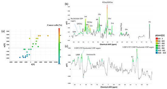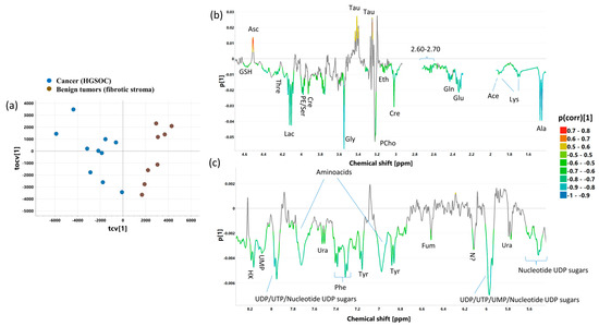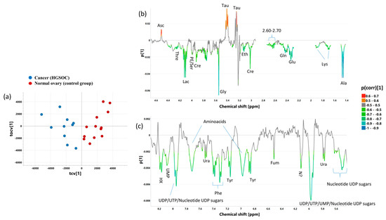 The cross-validated scores (a) and loadings plots [aliphatic region—(b), aromatic region—(c)] obtained from OPLS-DA 2CPMG model. The cross-validated scores for the predictive component are denoted as tcv[1], while for the orthogonal one, they are denoted as tocv[1]. The loadings for the predictive component are denoted as p[1]. The signals in the loadings plots are colored according to the p(corr)[1] values (the loadings scaled as correlation coefficients between the original data and the scores obtained for the first component). The abbreviations for metabolites are the same as in the legend of Figure 1.