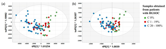 The predicted scores plots obtained from the OPLS-DA 1CPMG (a) and OPLS-DA 1J-res (b) models. The predicted scores plots for the predictive and orthogonal components are denoted as tPS[1] and toPS[1], respectively. C 0%—the samples containing no cancer cells, C 1–19%—the samples characterized by a cancer content of 1–19%, and C 20–100%—the samples characterized by a cancer content of 20–100%.