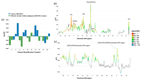 The cross-validated scores and loading plots obtained from the OPLS-DA 1CPMG model (R2 = 85.8%, Q2 = 74%, p CV-ANOVA = 0.000042) differentiating cancer from normal ovary tissue and from the OPLS-DA 2CPMG model (R2 = 92.3%, Q2 = 74.4%, p CV-ANOVA = 0.00083) discriminating cancer from the benign lesions are presented in Figure 7 and Figure 8, respectively. The p(corr)[1] values (loadings scaled as correlation coefficients between the original data and scores obtained for the first component), the variable influence at projection (VIP) values for both models, and the results of the univariate statistical analysis (the fold-changes and the p values) for the metabolites contributing to the class separation are listed in Table S1. A good separation between the studied groups in the scores plots is apparent (Figure 7a and Figure 8a, for the OPLS-DA 1CPMG model and the OPLS-DA 2CPMG model, respectively). The loadings plots (Figure 7b,c and Figure 8b,c showing the corresponding aliphatic and aromatic ranges of the chemical shifts) indicate that the most important differentiating features are common in both models. They are as follows: