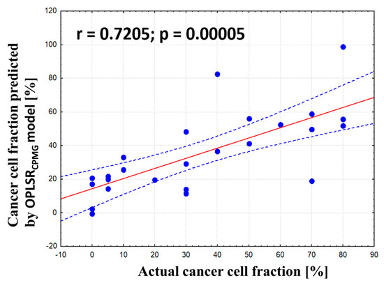 The relation between a metabolic profile (X data matrix) and a percentage of cancer cells (Y variable) was analyzed using an orthogonal partial least squares regression (OPLSR) method. The samples collected from malignant tumors containing mainly cancer cells and fibrotic stroma (the total contribution of these two components was required to be greater than 70%) were included in this analysis. When several samples from the same patient met this criterion, the sample with the highest cancer cell fraction was chosen for the development of the model.