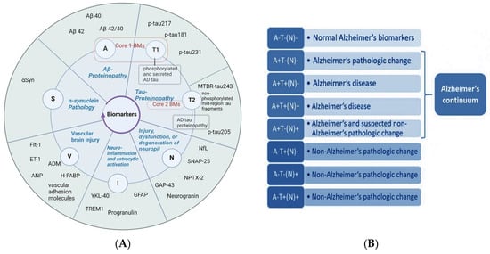 According to the 2018 National Institute on Aging–Alzheimer’s Association (NIA-AA) framework, AD should be considered in a biological context rather than a syndromic one, using an A/T/N classification system. In this system, “A” represents the concentration of Aβ biomarkers, “T” indicates the level of tau, and “N” reflects biomarkers of neurodegeneration []. This categorization prioritizes the classification of AD biomarkers according to pathological mechanisms. However, this framework assumes equivalence between cerebrospinal fluid (CSF) and imaging biomarkers within each AT(N) category [], an assumption that is not always supported by evidence. The AD diagnosis can be strengthened by including additional biomarkers that reflect changes in brain vascularity, Lewy body pathology, and neuroinflammation [].