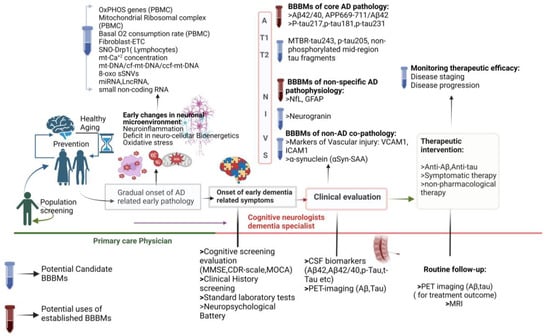 Timeline of patients’ journey integrated with blood-based biomarkers (BBBM). The figure illustrates the patient journey, starting with population screening and preventive strategies aimed at healthy aging. As AD-related pathology develops, BBBMs such as Aβ42/40, p-tau, and NfL are introduced during visits to a primary care physician for cognitive screening and early detection. Patients are then referred to specialists (neurologists or dementia experts) for clinical evaluation, which integrates BBBMs, CSF biomarkers, and PET imaging to confirm diagnosis. Biomarkers are also used for therapeutic intervention and monitoring disease progression, supporting treatment strategies like anti-Aβ or anti-tau therapies.