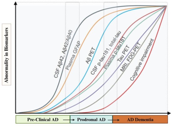 An approximate relationship between biomarker abnormality and the Alzheimer’s disease (AD) continuum (pre-clinical, prodromal, and AD dementia). The figure demonstrates the progressive increase in biomarker abnormalities across the AD continuum. In the pre-clinical phase, changes in CSF Aβ42, Aβ42/Aβ40 ratio, and plasma GFAP occur early. As the disease progresses to the prodromal phase, abnormalities in Aβ PET, CSF p-tau181, total-tau, and plasma p-tau181 become evident. In the later stages, including AD dementia, abnormalities in tau PET, MRI/FDG-PET, and cognitive impairment markers become pronounced. The figure illustrates the evolving nature of these biomarkers in the context of AD progression.