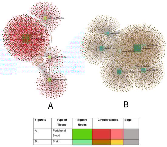 Additionally, we used the miRNeT 2.0 database (https://www.mirnet.ca/ (accessed on 28 August 2024) to analyze the interaction network of predicted AD-related microRNA biomarkers with validated target genes. This network was visualized to prioritize key microRNA biomarkers and their roles in gene regulation within both peripheral blood and brain tissues. For clustering, we set parameters such as organism (Homo sapiens), ID type (miRBase ID), tissue types (peripheral blood and brain), and target database (miRTarBase v9.0). Network topology features such as degree and betweenness centrality were used to analyze microRNA-microRNA interactions further.