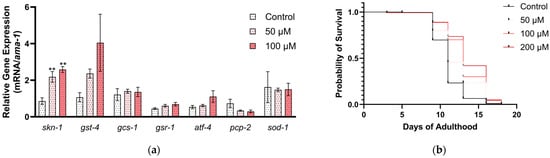 - Oliveira, R.P.; Abate, J.P.; Dilks, K.; Landis, J.; Ashraf, J.; Murphy, C.T.; Blackwell, T.K. Condition-adapted stress and longevity gene regulation by Caenorhabditis elegans SKN-1/Nrf. Aging Cell 2009, 8, 524–541. [Google Scholar] [CrossRef]