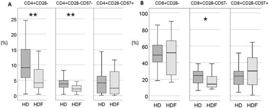 (A) Differences in expression of CD28 and CD57 surface markers on CD4+ T cells between patients on conventional hemodialysis (HD, N = 36, lined bars) and online hemodiafiltration (HDF, N = 26, gray bars). (B) Differences in expression of CD28 and CD57 surface markers on CD8+ T cells between patients on HD and HDF. T cell subsets are given as percentages. Statistic significance tested with Mann–Whitney U test, * p < 0.05, ** p < 0.01.