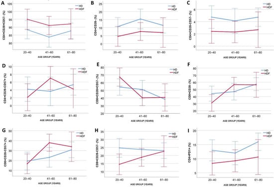ANCOVA for modality [Hemodialysis (HD) N = 36, Hemodiafiltration (HDF) N = 26] and age group (age group 20–40 N = 21, 41–60 N-21, 61–80 N = 20) for different T cell subset percentages. (A) Low differentiated CD4+CD28+CD57- T cells. (B) Highly differentiated CD4+CD28- T cells. (C) Highly differentiated CD4+CD28-CD57- T cells. (D) Senescent CD4+CD28-CD57+ T cells. (E) Low differentiated CD8+CD28+CD57- T cells. (F) Highly differentiated CD8+CD28- T cells. (G) Highly differentiated CD8+CD28-CD57- T cells. (H) Senescent CD8+CD28-CD57+ T cells. (I) Exhausted CD4+ T cells. The blue line represents patients undergoing HD, the red line represents patients undergoing HDF.