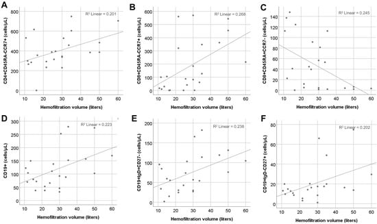Spearman correlation of hemofiltration volume applied to patients undergoing HDF (N = 26) with different T cell and B cell subsets. (A) Central memory CD4+ T cells. (B) Central memory CD8+ T cells. (C) Effector memory CD8+ T cells re-expressing CD45RA (EMRA). (D) Total B cells. (E) Naïve B cells. (F) Switched memory B cells.