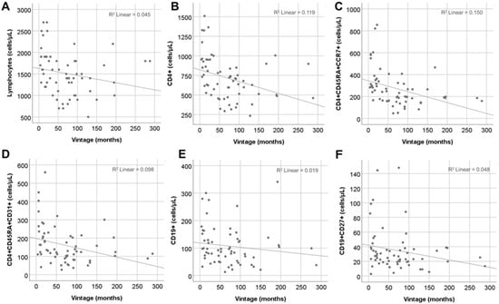 Dialysis vintage was negatively correlated with the total count of T cells and CD4+ T cells (r = −0.35, p = 0.005 and r = −0.46, p < 0.001, respectively), while total CD8+ T cells were not affected. The effect of vintage was evident only in low differentiation CD4+ T cell subsets (r = −0.51, p < 0.001, r = −0.38, p = 0.002, and r = −0.31, p = 0.01 for naïve, RTE, and central memory (CM) CD4+ T cells, respectively). Moreover, there was a significant negative correlation with CM CD8+ T cells (r = −0.29, p = 0.02). Finally, total B cell and memory B cell counts were also negatively correlated with dialysis vintage (r = −0.26, p = 0.04 and r = −0.25, p = 0.04) (Figure 4). However, in multivariate analysis for vintage and age, the effect of vintage remained significant only for total CD4+ and naïve CD4+ counts, whereas age was the main predictive factor for CD4+ RTEs and B cell subsets (Table 3). Total lymphocytes and CM cells, in both CD4+ and CD8+ compartments, were not affected by vintage or age in the multivariate model.