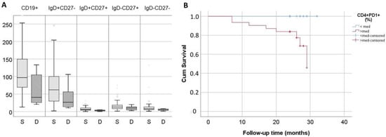 All patients and healthy controls were followed up prospectively after phenotypic evaluation for at least 24 months and deaths were recorded. In total, 13% (8/62) of patients died during the follow-up period. No deaths occurred in the healthy control group. Patients undergoing dialysis had an increased proportion of exhausted CD4+PD1+ T cells in comparison with healthy controls [11.6 (7–17.8) vs. 7.8 (5.4–11.7)% for patients and healthy controls, respectively, p = 0.01], with no difference in the corresponding CD8+ T cell subset. The percentage of CD4+PD1+ T cells had a tendency to increase with age, but did not reach statistical significance in comparison with healthy controls, the percentage of whom did differ among the three age groups (Supplemental Figure S1). Deceased patients had significantly higher proportions of exhausted CD4+PD1+ T cells in comparison with survivors [18.8 (14–25) vs. 11.5 (7–16.9)%, respectively, p = 0.006] and decreased counts of total B cells [40 (24–115) vs. 97 (70–150)cells/μL, respectively, p = 0.02]. This difference affected mainly naïve and IgM memory B cells (Figure 5A). Kaplan–Meier survival analysis for patients with proportions of CD4+PD1+ above and below median was significant (p = 0.002) (Figure 5B). Moreover, a significant effect of exhausted CD4+PD1+ T cell proportion remained in Cox regression, either when examined alone as a continuous variable (p = 0.003, 95%CI: 1.0, 1.2) or in combination with age (CD4+PD1+ proportion: p = 0.03, 95% CI: 1.01, 1.23, age: p = 0.02, 95% CI: 1.01, 1.44).