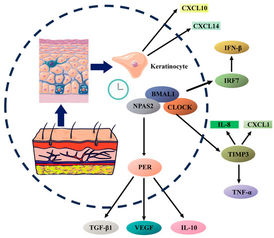 In mouse models, the expression of interferon regulatory factor 7 (IRF7) is elevated during the day compared to nighttime. Conversely, in BMAL1-deficient transgenic mice, IRF7 expression is increased, accompanied by a rise in serum IFN-β levels that lack a clear pattern [191]. This indicates that the core clock gene BMAL1 acts as a negative regulator of IFN-β release from keratinocytes, with responses being time-dependent and influenced by feeding schedules [191]. In human keratinocytes, TIMP3 influences signaling pathways by inhibiting metalloproteinase activity, subsequently affecting the secretion and activity of cytokines, thus mitigating skin inflammation. UVB radiation decreases TIMP3 expression in human keratinocytes via the CLOCK gene, leading to the overexpression of factors such as TNF-α, IL-8, and CXCL1 [182]. TNF-α enhances antigen presentation and induces the release of pro-inflammatory cytokines and chemokines, thereby regulating the recruitment of immune cells. Both IL-8 and CXCL1 are chemokines that promote the chemotaxis and activation of neutrophils, facilitating their arrival at inflammation sites and supporting skin regeneration and repair [192,193,194].