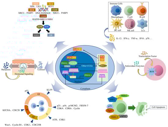 As the outermost physical barrier of the body, the skin is daily exposed to UVR, which can lead to a variety of skin issues, including photoaging, sunburn, and the most lethal skin cancer—melanoma [74]. Human skin utilizes melanocytes in the epidermis to synthesize melanin and on the thickening of keratin in the stratum corneum to absorb and scatter UVR, thus protecting cells from damage [75]. When UVR penetrates the skin barrier and causes cellular damage, circadian expression and localization of various proteins are altered. For instance, narrow-band UVB radiation decreases CRY2 expression in the epidermis and dermis but increases CRY1 expression in subcutaneous fat [76]. PER1 expression decreases within 12 h of UVB exposure, while BMAL1 and CLOCK expressions are suppressed at 20 and 24 h, respectively. Subsequently, these gene expressions recover and exhibit rhythmic variations [76,77]. UVC radiation affects the nuclear levels of the RNA-binding protein hnRNPR, which in turn impacts the post-transcriptional regulation of CRY1 mRNA, and can induce the nuclear translocation of PER1 and CRY1 proteins post-UVC exposure [78]. As shown in Figure 1, these circadian changes impact mechanisms such as DNA damage repair, cell cycle control, apoptosis, and oxidative stress, profoundly influencing the process of UVR-induced skin photoaging [79,80].
