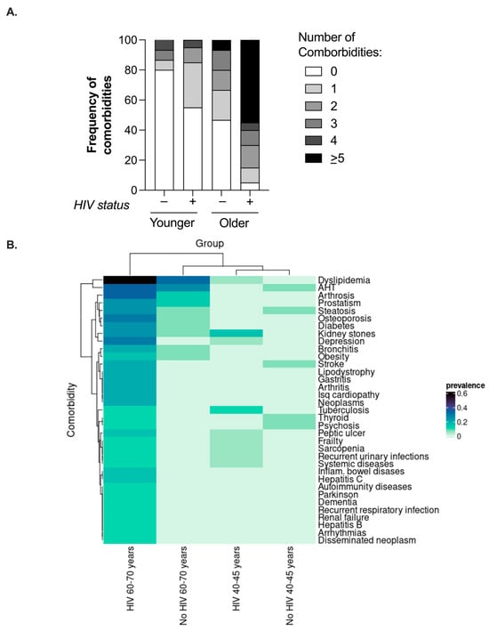 Comorbidities in the study groups. (A) Number of comorbidities according to age and HIV status. (B) A heat map representing the relative frequency of each comorbidity in each group.