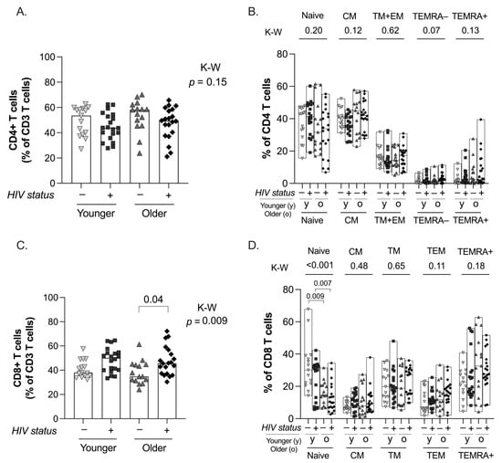 The frequency of CD4 T cells was similar between groups independent of age (p = 0.15 K-W test, Figure 2A). Regarding CD4 T-cell subset distribution, the frequency of TEMRA-CD4 T cells tended to be different between groups without reaching statistical significance (p = 0.07 K-W test, Figure 2B). The CD8 T-cell compartment showed more differences. As expected, the frequency of CD8 T cells was significantly different between groups (p = 0.009 K-W test, Figure 2C); in particular, older PWH on ART showed statistically higher frequencies compared to their uninfected counterparts (p = 0.04, Dunn’s comparison test). In addition, the frequency of CD8 naïve T cells was significantly different between study groups (Figure 2D; p < 0.001 K-W test), with lower frequencies in both older groups observed, regardless of HIV status (p = 0.007 and p = 0.009 between younger and older PWH on ART and control groups, respectively, Dunn’s comparison tests). In contrast, we did not observe any significant differences in the memory compartment according to age groups.