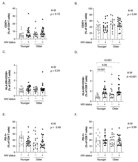 Immune senescence, activation, and exhaustion of CD4 and CD8 T cells. The frequency of senescent (CD57+) CD4 (A) and CD8 T cells (B) are plotted for the 4 groups under study. A comparison of the levels of immune activation, measured by the frequency of HLA-DR+CD38+ cells, is shown for CD4 (C) and CD8 T cells (D). Finally, the frequency of exhausted (PD-1+) CD4 (E) and CD8 T cells (F) is plotted. For all panels, individual and median values are indicated for the 4 groups under study: younger uninfected (inverted triangles), younger PWH on ART (squares), older uninfected (triangles), and older PWH on ART (diamonds). p-values from Kruskal–Wallis tests are indicated for the comparison among the 4 groups under study, and only significant p-values from Dunn’s multiples comparison tests between groups are shown.