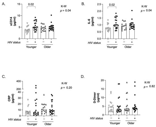 Statistically significant differences between groups in sCD14 and IL-6 were seen (p = 0.04 K-W test in both cases, Figure 4A,B), being the levels of both soluble markers significantly higher in the younger PWH on ART group compared to the younger controls (p = 0.02 Dunn’s correction tests, in both cases). The levels of those markers in the younger PWH on ART group were comparable to those found in both older groups. We did not find differences between the groups in the plasmatic levels of CRP and D-dimer (Figure 4C,D).