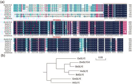 Amino acid sequence alignment and phylogenetic analysis of ZmGLYI-8. (a) Alignment of the amino acid sequence of ZmGLYI-8 with those of its homologous proteins. (b) Phylogenetic tree of ZmGLYI-8 in different plant species. The accession numbers of the selected ZmGLYIs were as follows: AtGLYI (NP-176896.1), Arabidopsis; GmGLYI (XP-003530499), Glycine max; OsGLYI (LOC4338161), Oryza sativa; BdGLYI (XM-003508671.1), Brachypodium distachyon; HvGLYI (AK364964.1), Hordeum vulgare and SbGLYI (XM002440785.1), Sorghum bicolor.
