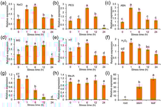 Analysis of ZmGLYI-8 expression in maize seeds. (a–h) Expression patterns of ZmGLYI-8 under 150 mM NaCl (a), 10% PEG-6000 (b), 50 µM ABA (c), 10 mM MG (d), HT (38 °C) (e), 0.5 mM H2O2 (f), 5 mM ET (g) and 50 µM MeJA (h) treatment. (i) Expression levels of ZmGLYI-8 in roots, stems and leaves. Different letters above columns indicate significance difference (p < 0.05).