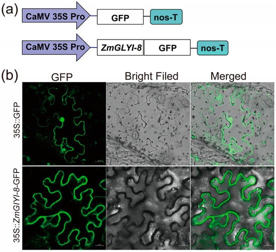 (a) Cytoplasmic localization of ZmGLYI-8. (b) The construct 35S:GFP: ZmGLYI-8 and the control vector 35S:GFP were transformed into Nicotiana tabacum leaves. Scale bar: 20 µm.