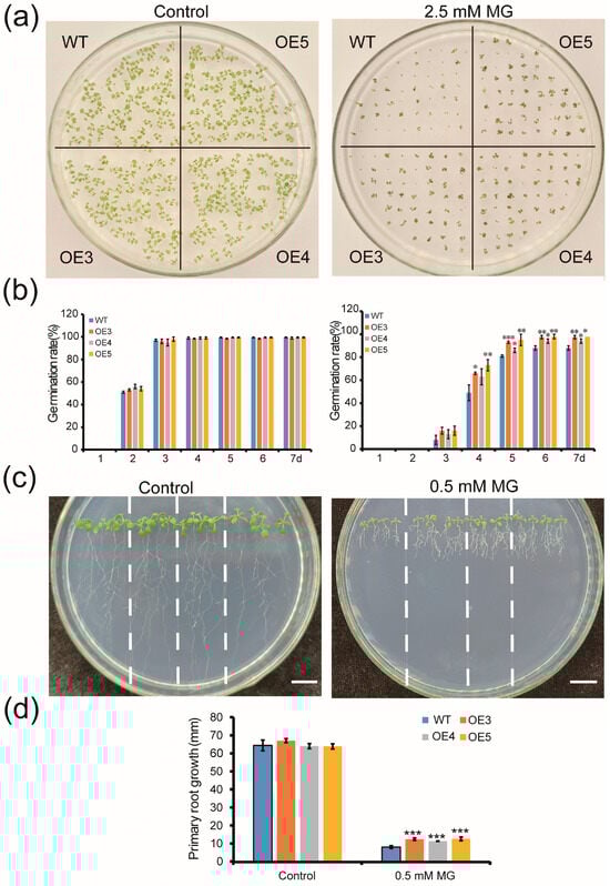 Phenotypic analysis of WT and transgenic Arabidopsis plants under MG treatment. (a) Seed germination of the WT, OE3, OE4 and OE5 plants treated with or without 2.5 mM MG for 7 days. (b) Seed germination rates in WT and transgenic seeds. (c) WT, OE3, OE4 and OE5 seedlings grown with or without 0.5 mM MG for 10 days. (d) Lengths of the primary roots of the WT and OE3, OE4 and OE5 plants WT, wild type. * p < 0.05, ** p < 0.01, *** p < 0.001. Scale bar: 10 mm.