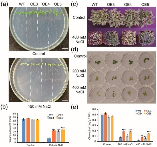 Phenotypic analysis of WT and transgenic Arabidopsis plants under salt treatment. (a,b) Phenotype and root length statistics of WT, OE3, OE4 and OE5 seedlings grown with or without 150 mM NaCl for 10 days. (c) Phenotypes of WT, OE3, OE4 and OE5 plants treated with or without 400 mM NaCl for 2 weeks. (d,e) Leaf disc assay and chlorophyll content under control and stress conditions (200 and 400 mM NaCl). * p < 0.05, ** p < 0.01, *** p < 0.001. Scale bar: 10 mm.
