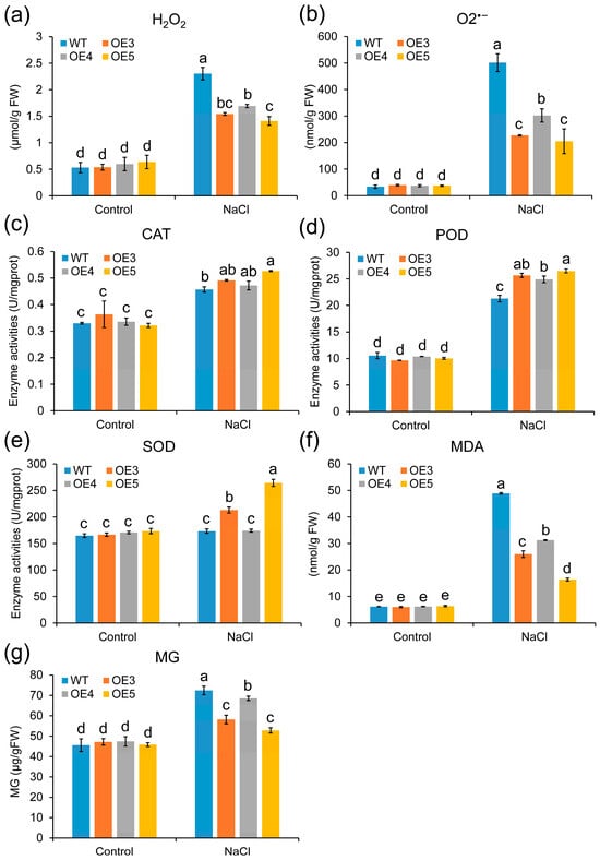 Physiological parameters after 7 days of salt treatments. (a,b,f) Oxidative stress indicators H2O2, O2•− and MDA content, respectively. (c–e) CAT, POD and SOD antioxidative enzyme activities, respectively. (g) MG content. Different letters above columns indicate significance difference (p < 0.05).