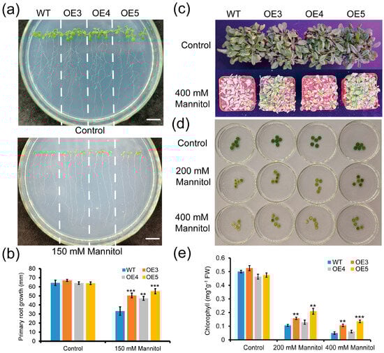 Phenotypic analysis of WT and transgenic Arabidopsis plants under drought treatment. (a,b) Phenotype and root length statistics of WT, OE3, OE4 and OE5 seedlings grown with or without 150 mM mannitol for 10 days. (c) Phenotypes of WT, OE3, OE4 and OE5 plants treated with or without 400 mM mannitol for 2 weeks. (d,e) Leaf disc assay and chlorophyll content under control and stress conditions (200 and 400 mM mannitol). ** p < 0.01, *** p < 0.001. Scale bar: 10 mm.
