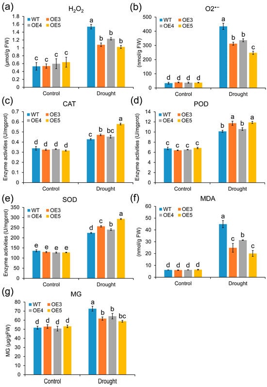 Physiological parameters after 7 days of drought treatments. (a,b,f) Oxidative stress indicators H2O2, O2•− and MDA content, respectively. (c–e) CAT, POD and SOD antioxidative enzyme activities, respectively. (g) MG content. Different letters above columns indicate significance difference (p < 0.05).