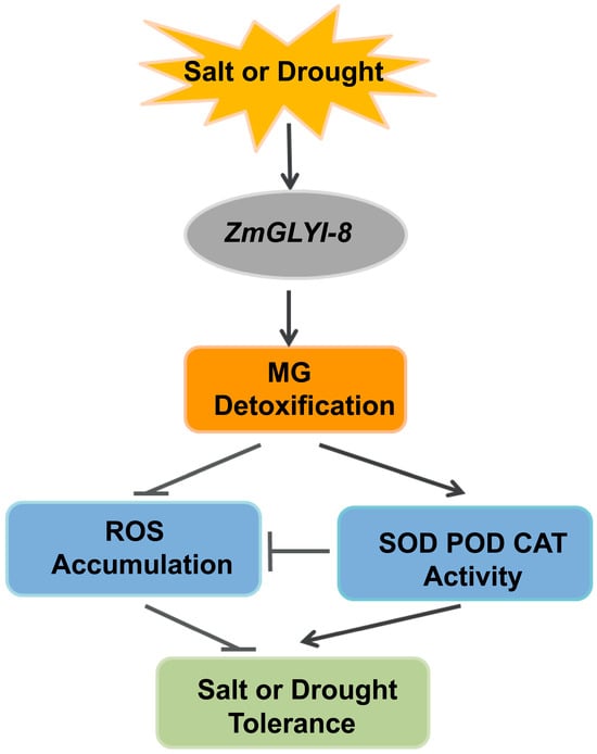 Maize is one of the most important food and feed crops and has important economic significance. With the intensification of global climate change, crops inevitably suffer from various abiotic stresses, such as salt, drought and high temperatures, during their growth and development, which seriously affects crop yield and quality [,]. When plants are subjected to abiotic stress, intracellular MG and ROS are overproduced, threatening the growth and development of plants. Both antioxidant and glyoxalase systems play important roles in the detoxification of ROS, and thus coordination of these systems can reduce ROS production, thereby alleviating oxidative stress and increasing plant tolerance to abiotic stresses [,,]. In this study, we demonstrated the role of ZmGLYI-8 gene in regulating abiotic stress tolerance in Arabidopsis by analyzing expression, phenotypic, physiological and biochemical data, in which overexpression of the ZmGLYI-8 gene reduces ROS production by detoxifying MG and increasing antioxidant enzyme activity, thereby enhancing the tolerance of transgenic Arabidopsis to salt and drought stress (Figure 9). Our study provided the theoretical basis for the application of GLYI gene in genetic improvement of crops for sustainable agricultural development. In future work, we will verify the function of the ZmGLYI-8 gene in maize or other crops and hope to widely apply the ZmGLYI-8 gene in the breeding of salt- and drought-tolerant crop varieties.