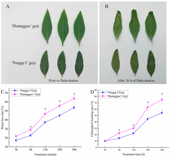 Analysis of leaf phenotype and cuticle permeability of ‘Ningqi I’ goji and ‘Huangguo’ goji. (A) Photos of ‘Ningqi I’ goji leaves and ‘Huangguo’ goji leaves before dehydration; (B) photos of ‘Ningqi I’ goji leaves and ‘Huangguo’ goji leaves after dehydration; (C) comparison of dehydration rate of ‘Ningqi I’ goji and ‘Huangguo’ goji leaves after dehydration for 36 h; (D) comparison of chlorophyll leaching rate between ‘Ningqi I’ goji and ‘Huangguo’ goji leaves after alcohol soaking for 36 h. Vertical bars represent standard deviations of the means (n = 3). Significant differences between ‘Ningqi I’ goji and ‘Huangguo’ goji leaves at the p < 0.05 levels were indicated by ‘*’, according to Student’s t-test.