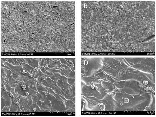 Scanning electron micrograph of wax on surfaces of ‘Ningqi I’ goji and ‘Huangguo’ goji leaves. (A) A 400× magnification of ‘Ningqi I’ goji leaf epidermis wax, (B) a 1000× magnification of ‘Ningqi I’ goji leaf epidermis wax, (C) a 400× magnification of ‘Huangguo’ goji leaf epidermis wax, and (D) a 1000× magnification of ‘Huangguo’ goji leaf epidermis wax.