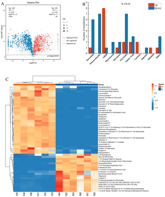 Analysis of differential metabolites in leaves of ‘Ningqi I’ goji and ‘Huangguo’ goji. (A) Top 50 differential metabolites shown using volcano plot; (B) differential metabolites classification plot; and (C) cluster heat map. ‘N’ represents ‘Ningqi I’ goji and ‘H’ represents ‘Huangguo’ goji.